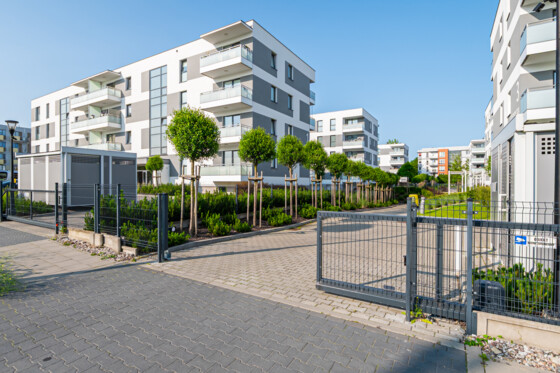 Teren wokół budynków został kompleksowo zaprojektowany z dbałością o estetykę i funkcjonalność. Znajdziesz tu liczne nasadzenia zieleni, krzewy ozdobne, wyniesione patia oraz wygodne alejki spacerowe, które tworzą kameralne, zielone strefy relaksu – idealne na chwilę oddechu po pracy. Co ważne, ruch samochodowy został ograniczony – osiedle jest przyjazne pieszym, dzieciom i rowerzystom.Dodatkową wartością jest automatyczny system nawadniania roślin, który zapewnia bujność zieleni niezależnie od pogody. Wydzielony plac zabaw sprawia, że najmłodsi mieszkańcy mogą bezpiecznie spędzać czas tuż obok swojego domu.